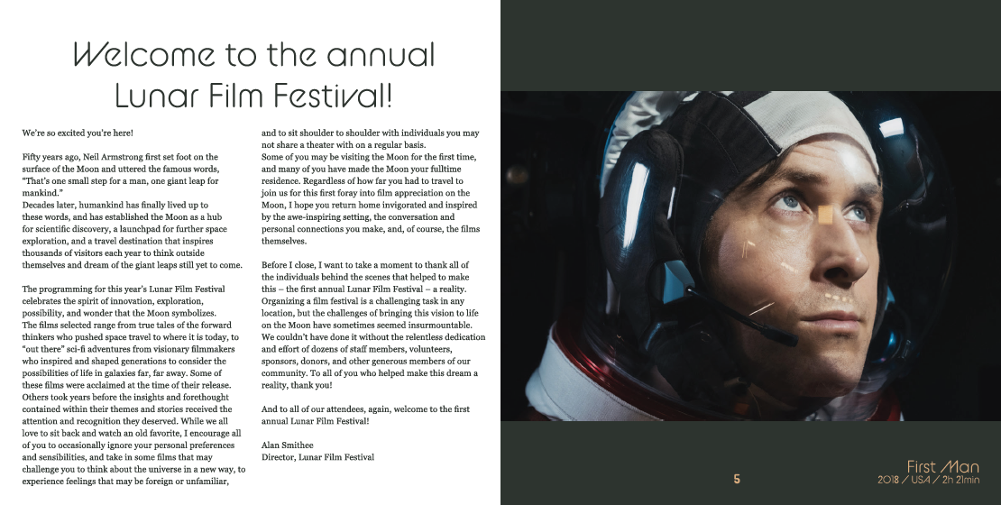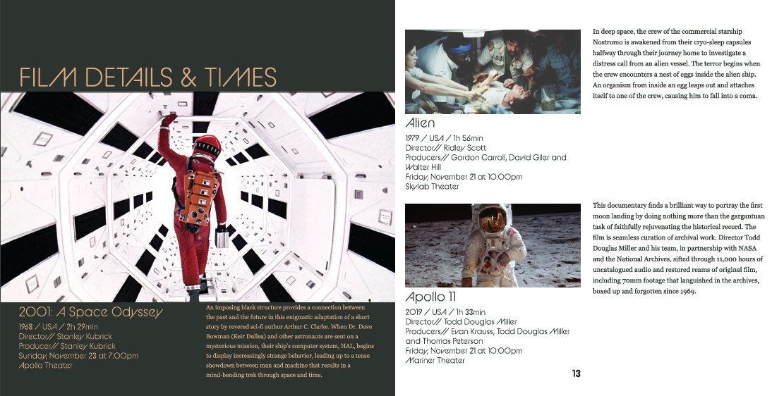 This project involved designing a booklet for a film festival to be used both as an informative guide of when different films were showing as well as giving information about each movie itself. I was responsible for laying out the information for each film, including the type, pictures, and overall layout. I was also responsible for selecting the photos that would be used as well as choosing which type to use and where.