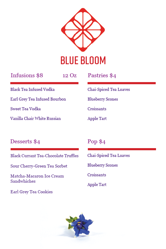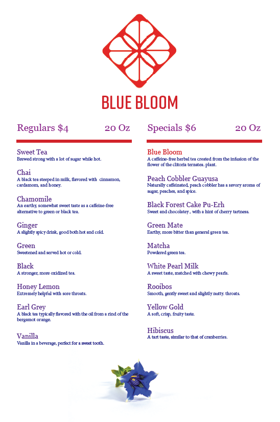 A project where I was responsible for creating the logo and brand of a tea company, as well as design the look of multiple different pieces of merch such as napkins, business cards, and coasters. The designs are based around the Butterfly Pea Tea. A species of tea that’s known for changing color as it steeps. This design choice is most well shown through the menu, but is present in all of the designs which feature the Blue Bloom name primarily in red on mediums.