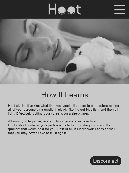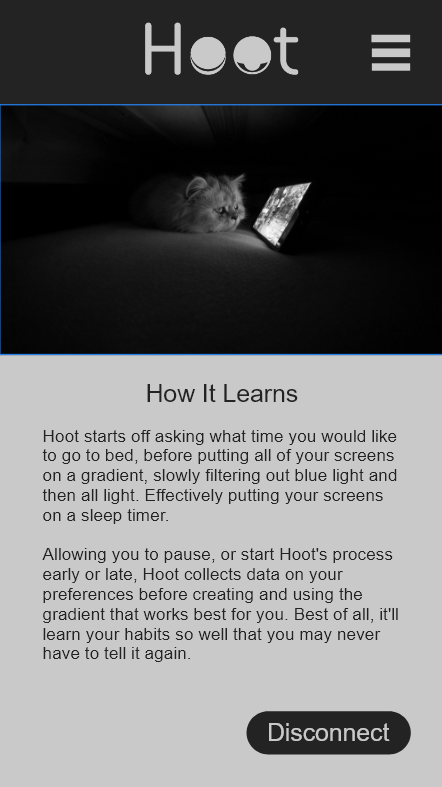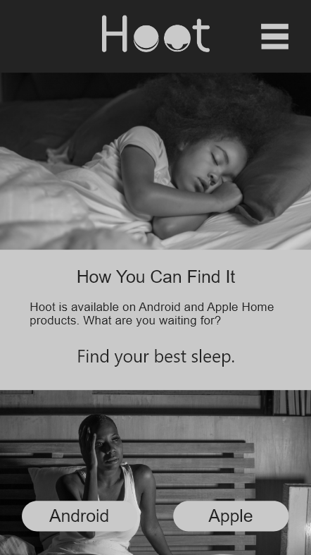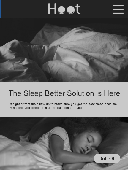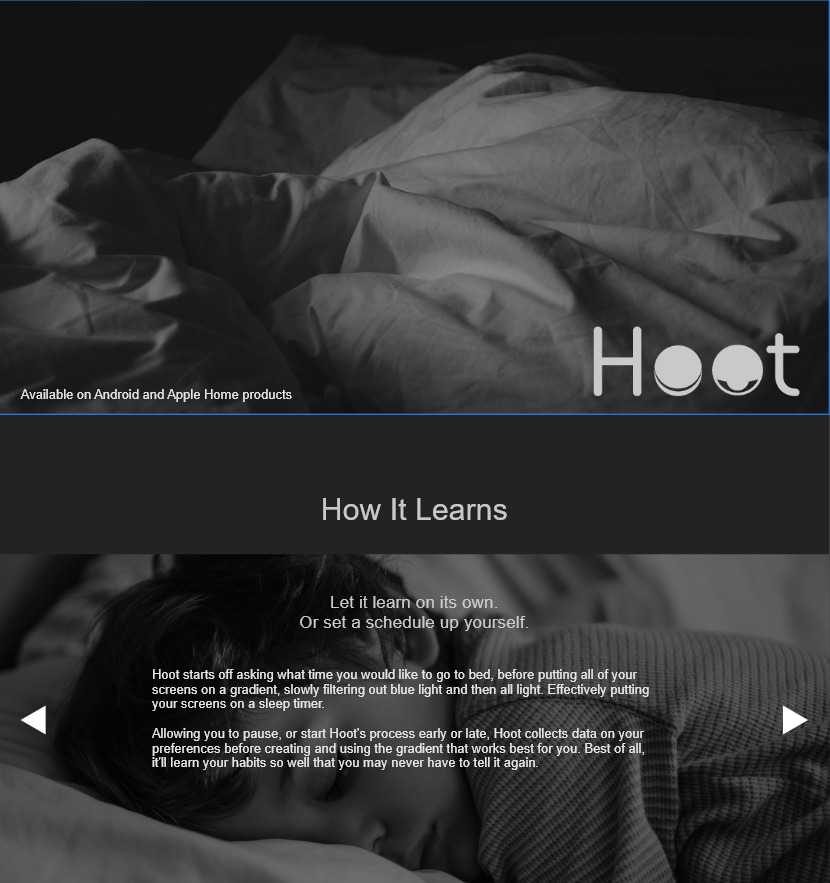 A(n) responsive advertisement made for the application “Hoot.” During this project I created the idea of the business, created the logo for the business, and prototyped how the application would work. I also designed, mocked up, and prototyped the interactive advert created to entice users into downloading the hypothetical application. Hoot would be an application that would combine the use of alarm clocks and blue light filter screens to create an all in one quality of life function to help you sleep. This application would theoretically connect with home devices like Google Nests or Amazon Echoes. The advert was designed to give the general feeling the application would provide for you upon using it, as well as sitting at the main location for getting information both on how the application works as well as where it can be downloaded and used.